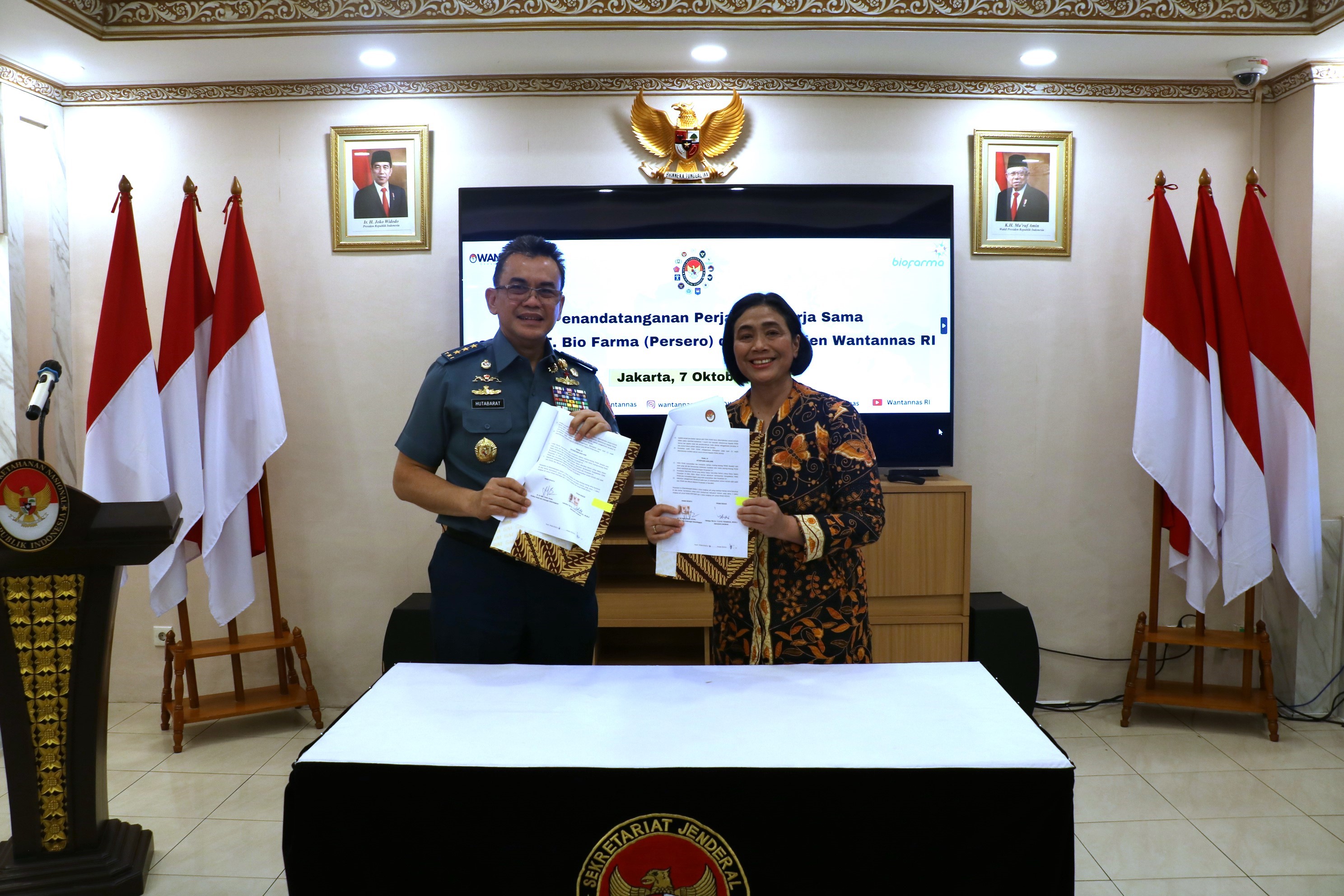 Sesjen Wantannas RI Laksdya TNI T.S.N.B Hutabarat bersama Direktur Medis dan Hubungan Kelembagaan PT. Bio Farma Sri Harsi Teteki melaksanakan pendandatanganan kerja sama penyediaan Vaksinasi Human Papillomavirus (HPV) dan Skrinning Kanker Serviks melalui tes urin yang berlangsung di kantor Wantannas RI, pada Senin (7/10).
